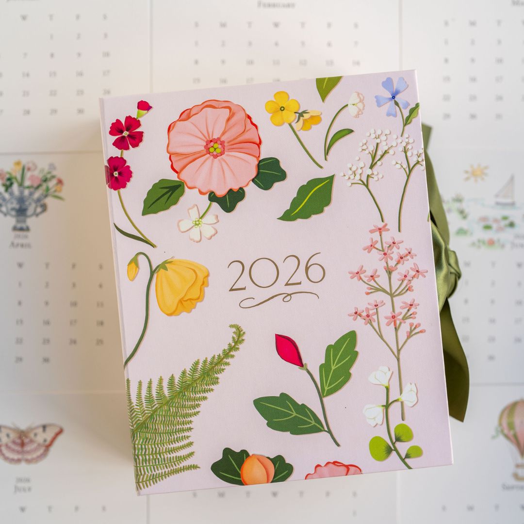 Twelve months of art for your desk. Each 6-inch square features an original Karen Adams design, printed and hand-finished in their studio. Full-color printing meets letterpress with hand-glittered details and foil accents. The calendar comes with a gold or silver easel to display the monthly artwork on your desk, shelf, or counter. Packaged in a custom box with ribbon. This is the gift that keeps giving all year long. Perfect for the person who appreciates beautiful design in their daily life.