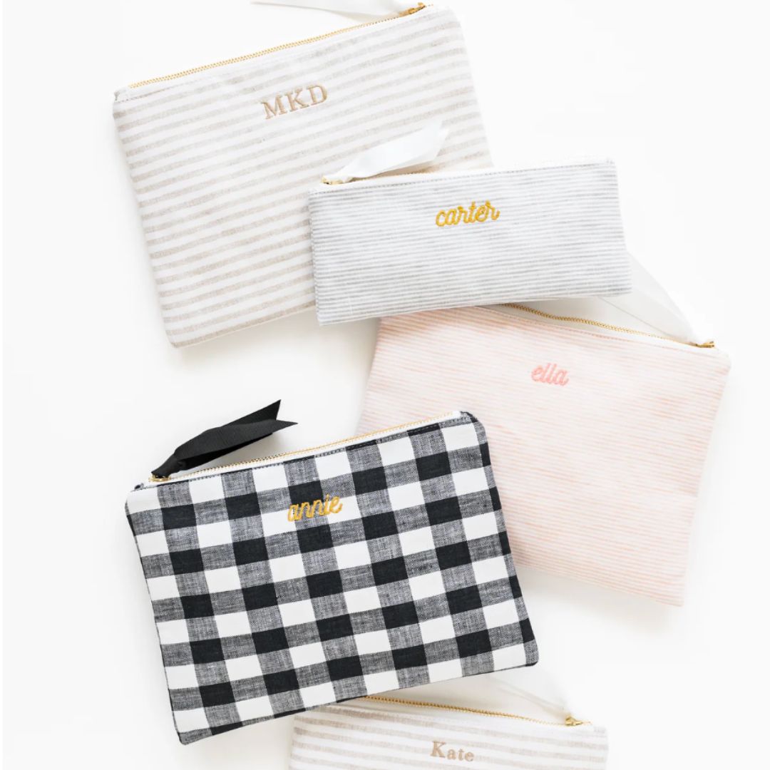 These aren’t just pouches. They’re the answer to every “where did I put that” moment. Sugar Paper’s signature fabric pouches come in multiple sizes with gold zippers and grosgrain ribbon pulls. Use them for cosmetics, travel essentials, or daily must-haves. Add a monogram to make it personal. Stay organized without sacrificing style.