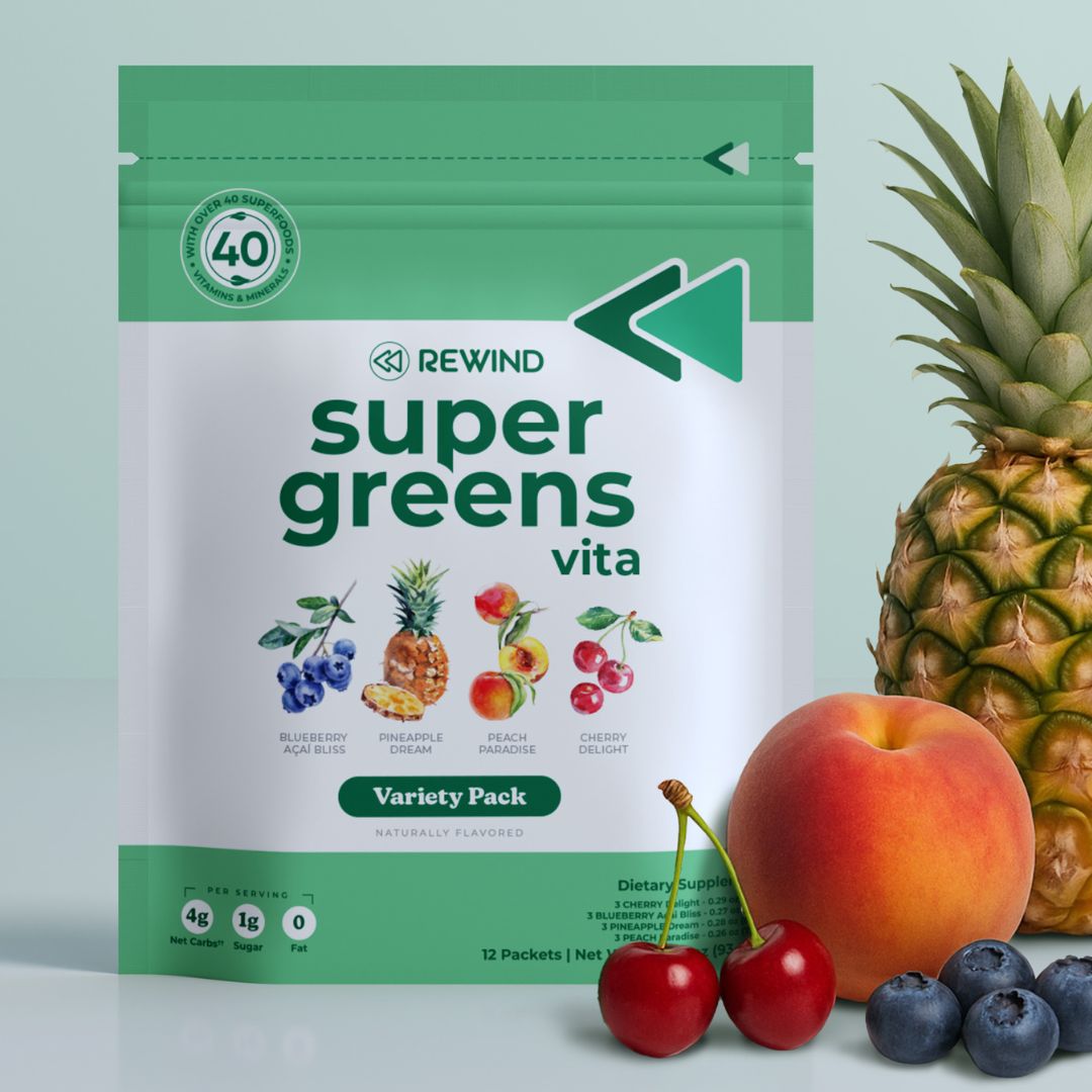 40+ superfoods in one scoop. Zero grassy taste. Rewind Greens won the ChefsBest Award for a reason. This superfood powder delivers your daily fruits and vegetables in four flavors that actually taste good. No fillers. No artificial ingredients. Just clean nutrition, the whole family will drink. The Variety Pack lets you try all four delicious flavors.